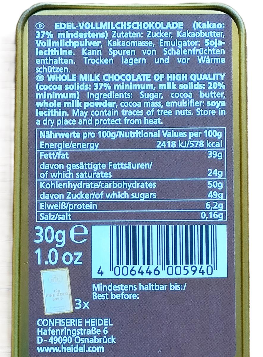 • Chocolat au lait supérieur, 10 g chacun, avec au moins 37 % de cacao.