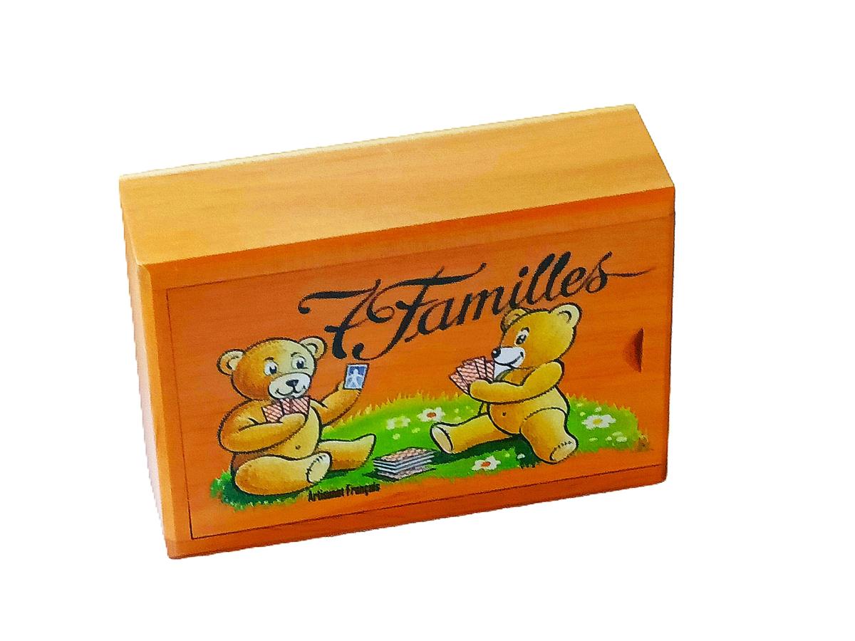 Boîte En Bois Vide pour jeu des 7 familles, objet fabriqué dans le département du Jura, dimensions L10,50xl7,50xh3,30 cm. Livrée sans le jeu de cartes.